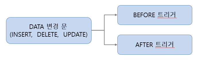 - 트리거(trigger)는 데이터의 변경(INSERT, DELETE, UPDATE)문이 실행될 때 자동으로 따라서 실행되는 프로시저를 말함.
