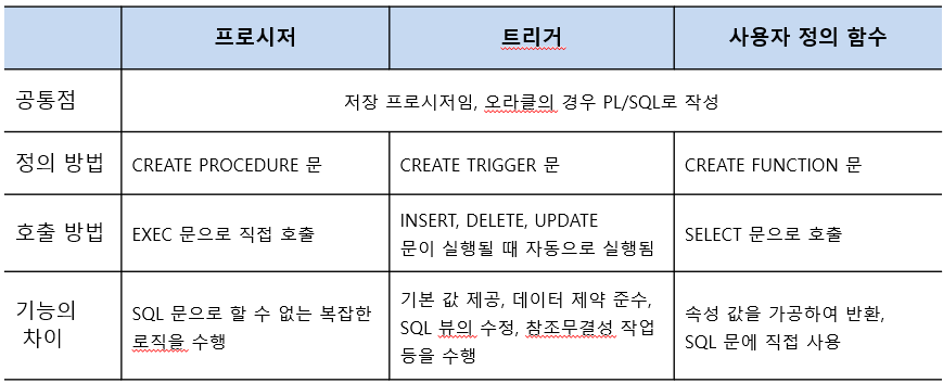 프로시저, 트리거, 사용자 정의 함수의 공통점과 차이점