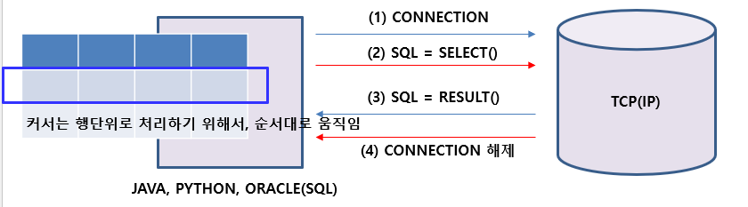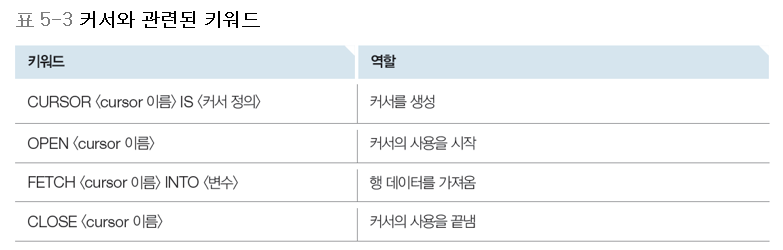 - 커서(cursor)는 실행 결과 테이블을 한 번에 한 행씩 처리하기 위하여 테이블의 행을 순서대로 가리키는 데 사용함.