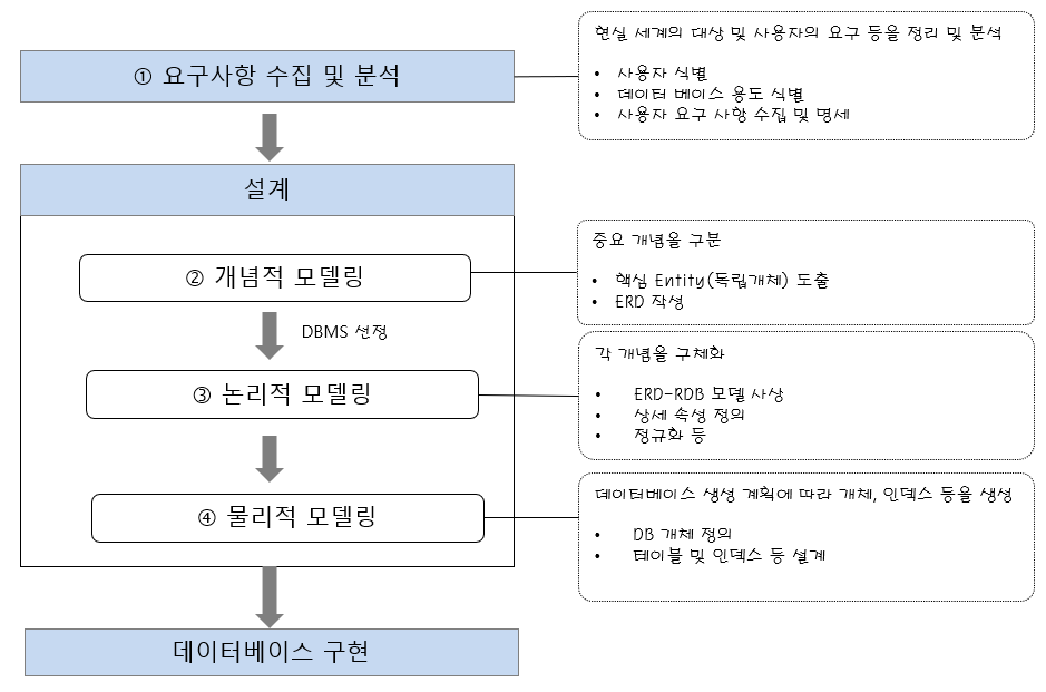 - 작성된 논리적 모델을 실제 컴퓨터의 저장 장치에 저장하기 위한 물리적 구조를 정의하고 구현하는 과정