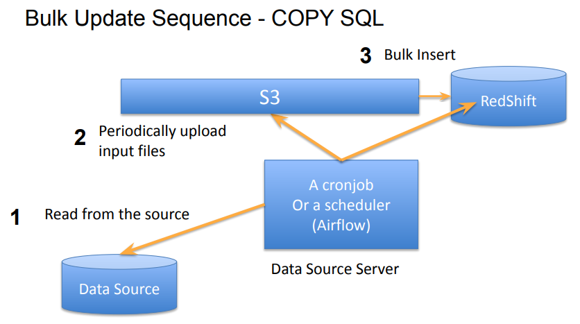 - CSV/JSON 파일을 S3에 업로드 -> S3에서 REDSHIFT로 복사
