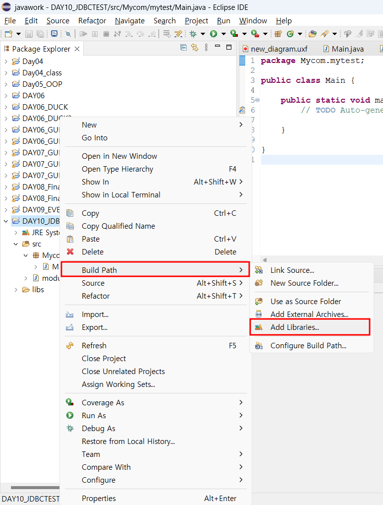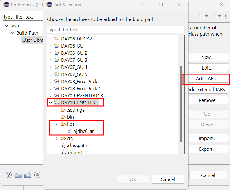 - 복사 후 자바 프로젝트 안에, libs 폴더 생성, ojdbc.jar 파일 넣기