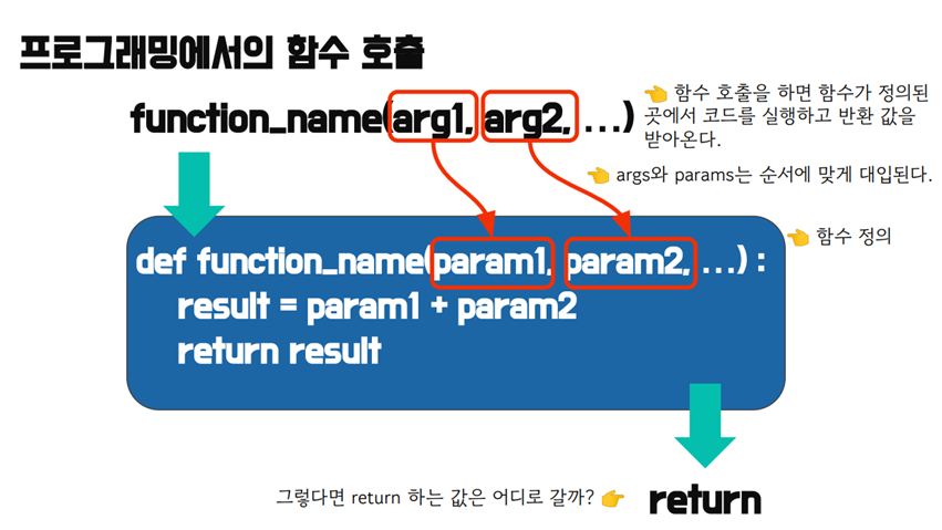 - 함수가 호출되면 함수정의부로 가서 함수 호출부의 인수 값을 함수 정의부 인자값에 순서대로 대입