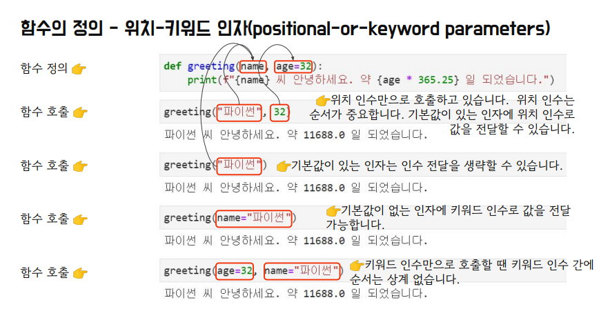 - 위치-키워드(positional or keyword) : 위치로 혹은 키워드로 전달될 수 있는 인자를 말합니다. 매개변수의 기본형태입니다.