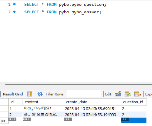 question_id가 2인 것에 대해서 answer가 만들어진 것을 볼 수 있습니다.(외래키)