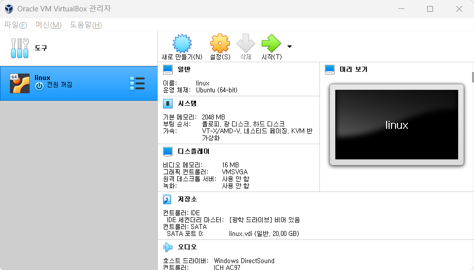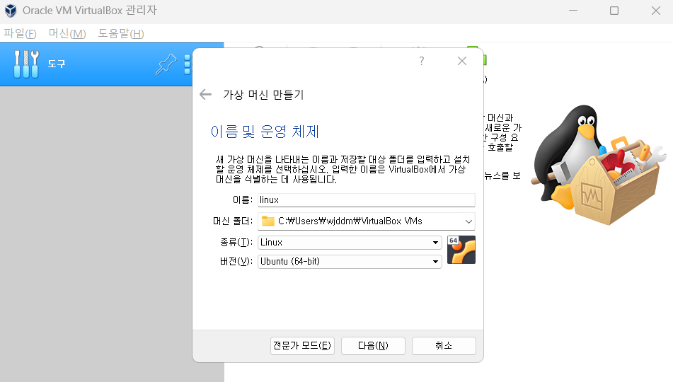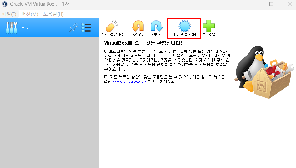 - VirtualBox 나오면 Oracle VirtualBox에서 새로 만들기