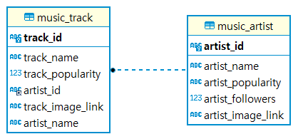 저희가 설계한 데이터는 아직까지는 tracks와 artists로 두 테이블만을 가지고, 일단은 간단히 웹을 구현할 생각입니다. 지금의 데이터베이스 설계는 이렇습니다.