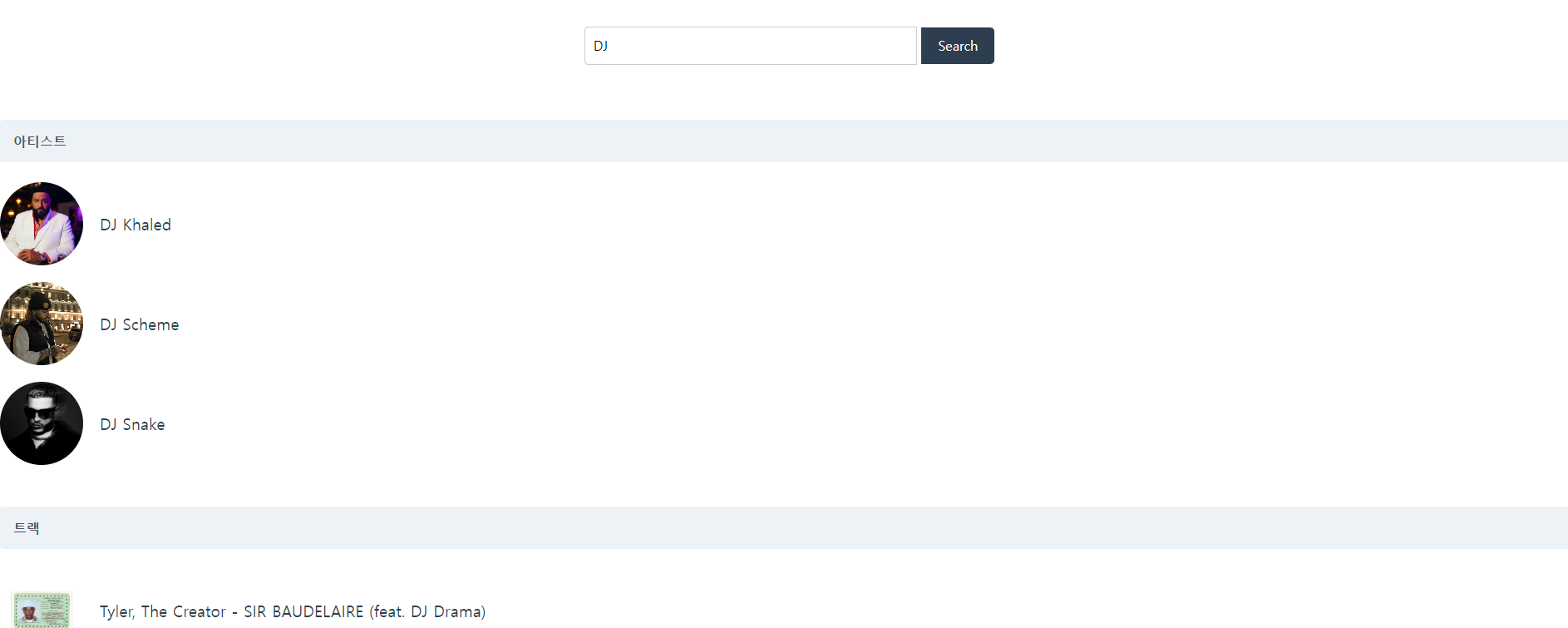 합친 list는 class_name(사용자 정의함수 사용)을 통해서 Artist, Track으로 분리되어 각각 표시합니다. 이렇게 구현한 이유는, 같은 검색 값에 대해서 아티스트와 트랙에 대한 모든 검색을 진행했으면 했습니다. 다만 이런 방법들이 조금 더 정교하고, 더 나은 성능으로 구현되려고 한다면 확실히 elastic search나 다른 검색을 위한 데이터베이스가 반드시 필요하겠다는 생각이 들었습니다.