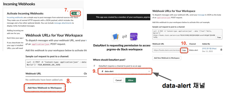 채널명은 미리 생성해둔 채널로 해두시고, 마지막에 webhook URL을 카피한 뒤, "https://hooks.slack.com/services/~" 뒤에 있는 코드들을 가져옵니다. 예시로는 T04FA~~~~/BE~~~~/BM~~~ 이런 식입니다. 채널명은 마음대로 하셔도 됩니다.