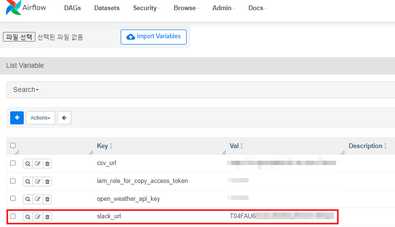 보시면 slack_url Variable을 가져와서 url을 통해서 전달하는 코드입니다. 이 파일을 /var/lib/airflow/dags/plugins 경로에 넣어두시고, DAG 중 하나를 골라서 일부로 에러를 내보겠습니다.