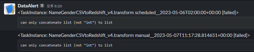 슬랙에 메세지가 잘 온걸 확인할 수 있습니다. 기다려보면서 본건데, 일단 retry가 발생했고, retry 딜레이가 모두 끝나면 그 때 fail 메시지를 발송합니다. 그리고 저는 retry가 1회였기 때문에 총 2회의 fail 메시지가 온걸 확인할 수 있습니다. 또한 아까 말씀드렸듯이 리스트에 숫자를 더했기 때문에 해당 오류메세지가 잘 온것을 확인할 수 있습니다.