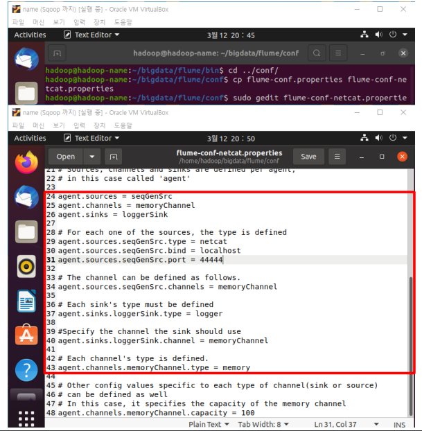 (1) flume-conf.properties에 진입해서, 위쪽 이미지와 동일하게 설정합니다. 29번 라인부터 31번까지 추가하시면 됩니다.