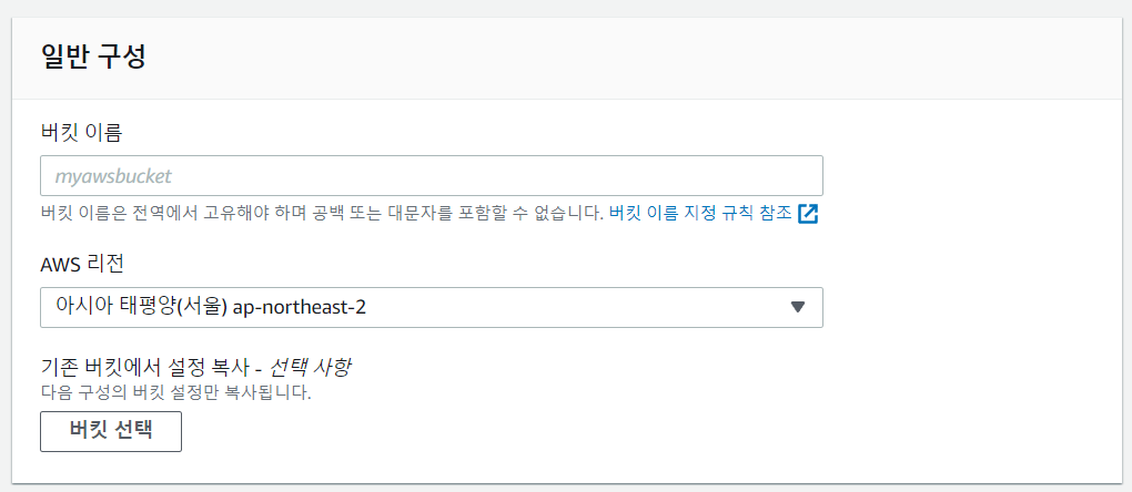 (2) 버킷 이름은 전역 고유기 때문에, 잘 작성해주시고, 리전을 선택하신 뒤 넘어갑니다.