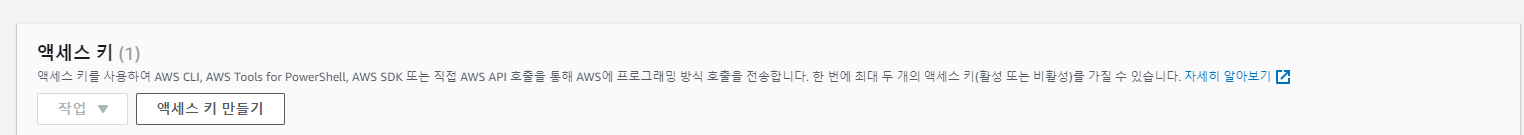 (2) 나온 페이지에서 그대로 스크롤 내리셔서 액세스 키를 찾고, 액세스 키 만들기를 클릭합니다. 그러면 루트 액세스 키에 대한 경고가 나올텐데, 후에 일단 테스트 겸 하는 것이기 때문에 IAM 사용자는 나중에 만들도록 하고, 계속해서 생성합니다.