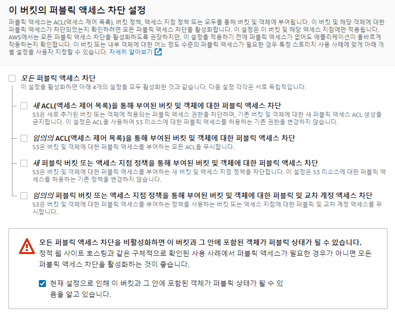 (3) 이 부분을 액세스 차단을 해제해줍니다. 퍼블릭 액세스 관련 옵션인데, 퍼블릭 액세스를 켜려면 이 부분을 해제 해주셔야합니다.
