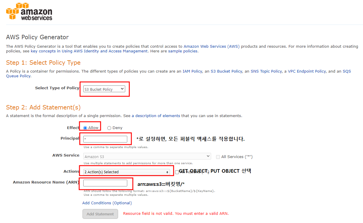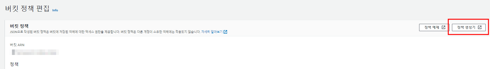 (7) 권한 탭에서 버킷정책 - 편집을 클릭하시면 이 탭이 나옵니다. 그리고 들어가서 정책 편집기를 클릭하시면, AWS POLICY GENERATOR 페이지가 나올 겁니다.