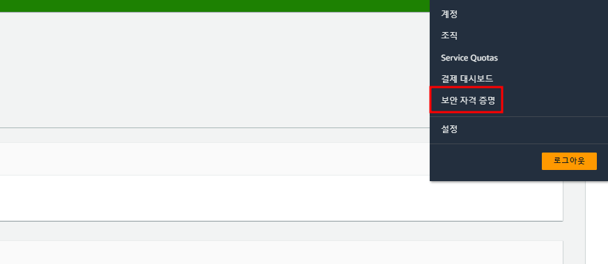 (1) 우측 상단 탭에서 ID를 클릭하시고, 보안자격 증명에 들어갑니다.