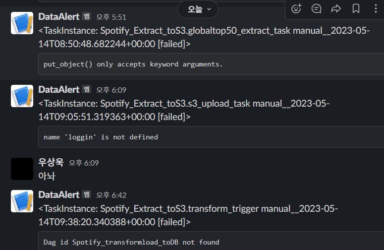 DAG와 TASK 중에서 일부만 보여드리면, Dag가 실패했을 때, 한번 재시도를 하게 해놨고, 또 슬랙으로 메세지가 오게끔 해놨습니다.