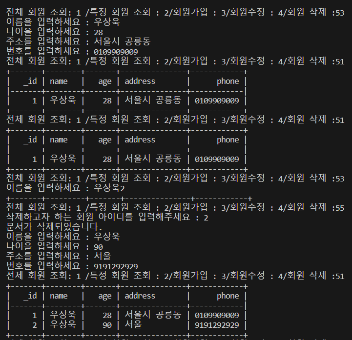 tabulate를 활용해서 데이터프레임을 터미널에서 깔끔하게 출력할 수 있습니다. 회원 조회에는 find 쿼리를 이용하고, 판다스를 이용해서 데이터프레임 형식으로 출력합니다. 이 때, find의 조건은 예쁘게 나오는게 조건입니다.