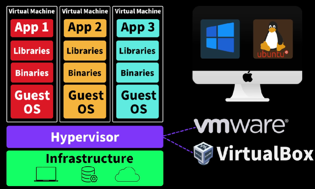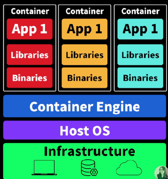 가상머신은 하드웨어 같은 Infrastructure 위에 Hypervisor를 이용해서, 각각의 가상의 머신을 만들 수 있습니다. 한 운영체제 위에서 동일한 어플리케이션을 각각의 고립된 하나의 환경에서 구동하기 위해선 이렇게 구동해야만 했습니다. 이 가상머신은 OS를 포함하고 있기 때문에, 굉장히 무겁고 시작하는데 오래 걸리고 Infrastructure의 리소스를 많이 잡아먹는 원인이 될 수도 있습니다. 이를 경량화 시킨 방식이 Container입니다.