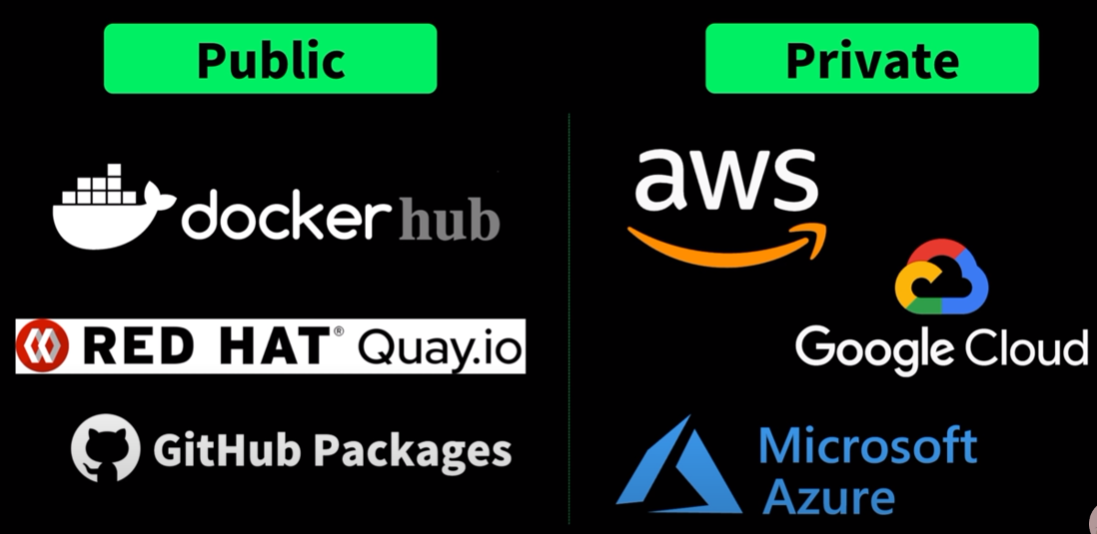 이 Image를 업로드 하기 위해서 Container Registry를 사용할 때, Public, Private으로 나뉘게 됩니다. 보통 Public으로 Image를 업로드할 때는 Docker hub를 많이 사용하며, 회사에서 프로젝트 등 image를 공개하고 싶지 않을 때, aws, gcp, azure를 사용합니다.