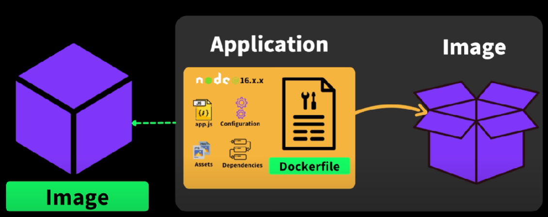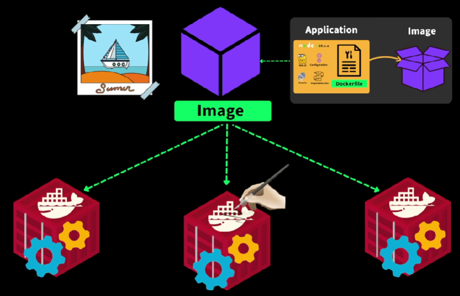 이렇게 작성한 Dockerfile을 이용해서 이미지를 만들 수 있습니다. 이 때 모든 세팅들이 포함되어있는 것들, 즉 실행되고 있는 appllication을 스냅샷으로 찍어서 저장해둡니다. 이는 불변의 상태입니다.