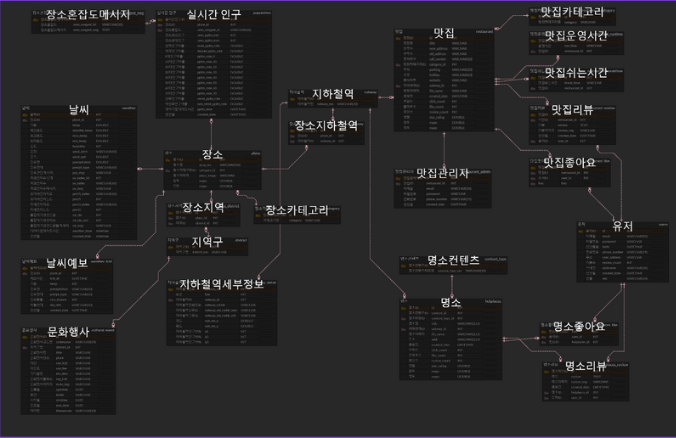 장소를 기준으로 데이터베이스를 설계하고 구축했습니다. 워낙 다양한 소스에서 온 데이터가 많아서, 관계를 주기 위해, 지역구, 지하철역 등이 사용되었습니다. 또한 정규화를 통해서 데이터 중복을 방지하고, 데이터의 일관성 유지를 했습니다. 다만 백엔드에서 처리할 로직이 조금 복잡해졌어서, 개발 기간이 조금 더 길어진 면이 있었습니다. 분명히 장단점이 있었어서, 나중에 한번 더 프로젝트를 한다면, 모든 사항을 고려한 뒤에 반정규화할 테이블은 골라놓고 시작할 것 같기도 합니다. 또 프로젝트 하다가 알게 된 사항인데, 컬럼 값으로 배열이나, json을 쓰는 방식도 고려된다고 합니다.