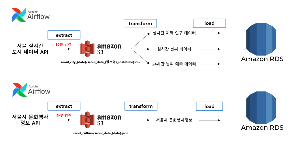수집용 데이터 파이프라인입니다. 서울 실시간 도시 데이터를 30분 간격으로 S3에 저장한뒤, 가공해서 DB의 세 개 테이블에 나눠서 적재하였습니다. 또한 문화 행사 정보 데이터는 하루 간격으로 DB에 적재하였습니다.