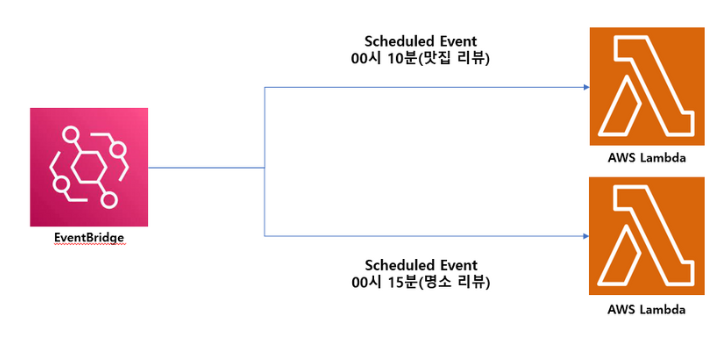 해당 LAMBDA 함수는 AWS의 event bridge를 통해서, 맛집, 명소 각각 매일 00시 10분, 00시 15분에 작동합니다.