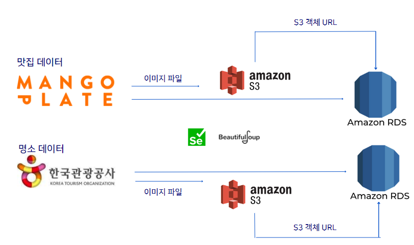 망고 플레이트와, 한국관광공사의 데이터를 1차적으로 크롤링 했습니다. 크롤링할 대는 beautiful soup과 selenium을 모두 사용했는데, 한 링크에 있는 url을 모두 따는 작업을 selenium을 활용했습니다(동적 페이지). 그리고 해당 url에 들어갔을 때, beautiful soup을 활용해서 관련 정보를 크롤링했습니다(정적페이지).