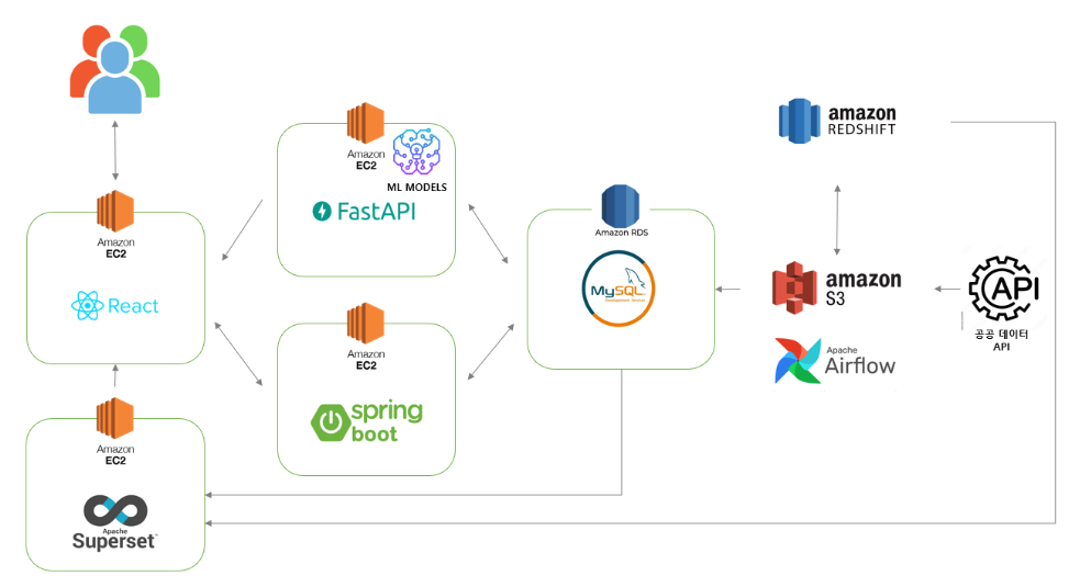 웹 구현에는, React와 Spring boot를 사용했습니다. 머신러닝 전용 API 개발은, 파이썬 환경에서 진행하기 위해서 FastAPI를 활용하였습니다. 그리고 데이터 분석 대시보드를 웹에 임베딩하기 위해서, Superset을 사용했습니다. 이 외에 모든 데이터 파이프라인은 Airflow로 구현하였으며, 분석용 데이터를 수집하기 위해서, 데이터웨어하우스로 aws redshift를 활용했습니다.