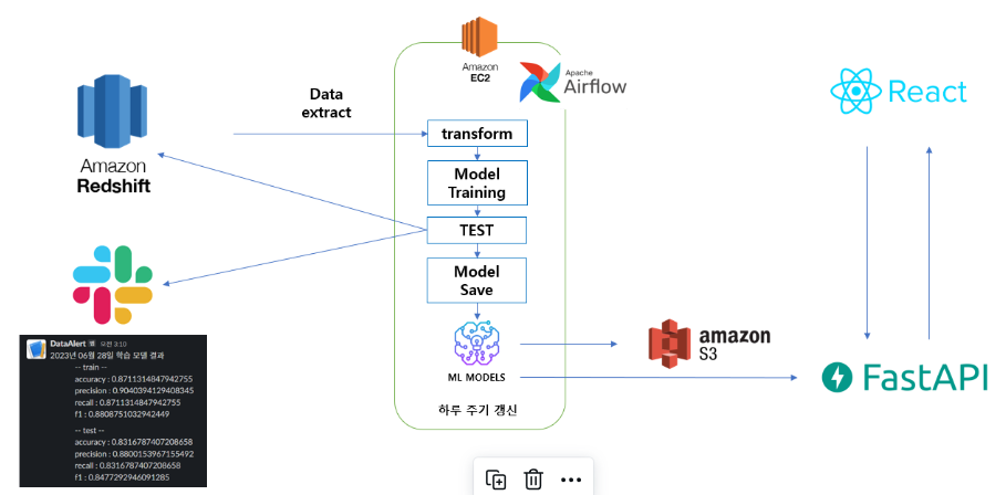 매일 새로운 데이터를 학습해서 새로운 모델을 배포하는 파이프라인입니다. 하이퍼파라미터 튜닝 같은 부분들은, 초기에 설정해둔 옵션으로 진행했습니다. 처음에는 aws sagemaker나 EC2 서버를 따로 열려고 했으나, 데이터의 사이즈나, 비용, 시간 면에서 굳이 사용할 필요가 없겠다고 판단한 후 구현된 파이프라인입니다. 학습 후에 테스트 값들은 모니터링할 수 있게 슬랙으로 전 팀원이 볼 수 있고, 매일 FastApi 서버로 배포되어서, FastApi 서버에선 해당 모델을 예측에 사용합니다.