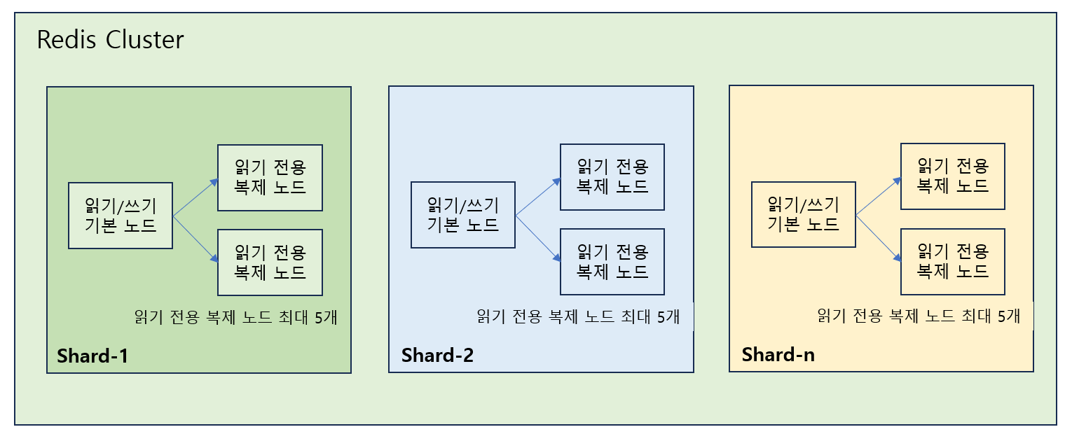 - ElasticCache에서 제공하는 주요 기능은 shard 내에 읽기 전용 복제 노드를 통해서 읽기 요청에 대한 시스템적 DB에 부하를 낮추고, 마스터 노드가 기능을 상실했을 경우, 레플리카 노드가 마스터 노드를 시스템에서 자동으로 대체할 수 있습니다.