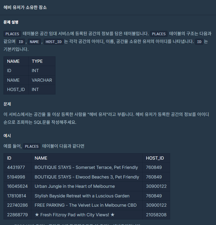 서브쿼리로 간단하게 풀 수 있는 문제였습니다. HOST_ID를 GROUP BY 한 것으로 COUNT를 세고, COUNT가 2보다 큰 HOST_ID를 가져와서 HOST_ID가 해당 튜플 안에 존재하는 걸 반환하면 됩니다.
