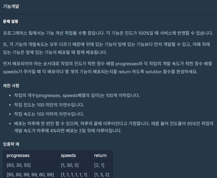 - 가장 먼저 progresses의 length를 판단해서 progresses의 첫번째 인덱스가 100보다 크거나 같을 경우, progresses와 speeds의 첫번째 인덱스 값을 동시에 pop