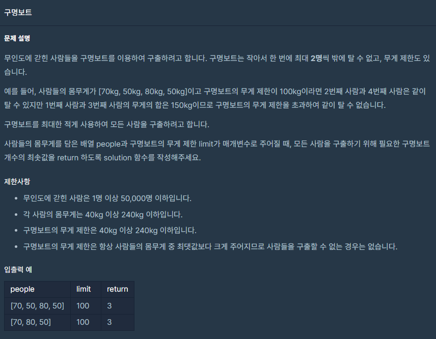 처음에 문제 풀이 제대로 안읽고 풀었다가, 빙 돌아갔다. 처음에는 구명보트에 작은 몸무게 가진 사람만 다 태워서 보내기 정도로만 풀었는데, 결국 구명보트를 최대한으로 이용하려면 앞 뒤를 이용해야했다. 자료구조를 이해하고 나서 풀기 쉬워진 게 많다.