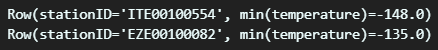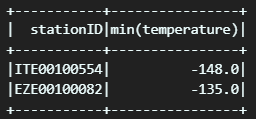 results = spark.sql("""SELECT stationID, MIN(temperature)