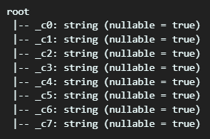 - 이 때 스키마 입력이 없었으므로, schema는 기본 값인 string으로, null 값은 true로 지정됩니다.