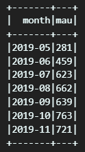 agg(countDistinct("userid").alias("mau")).sort(asc('month')).show()
