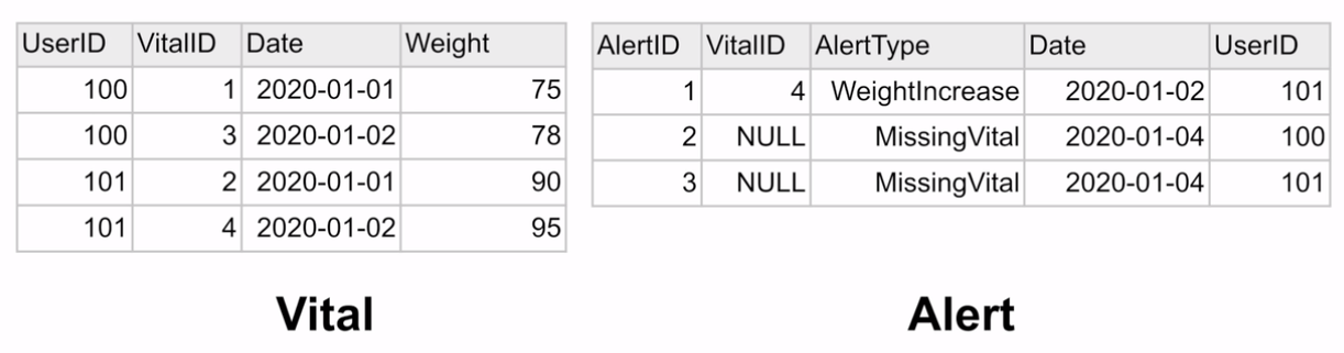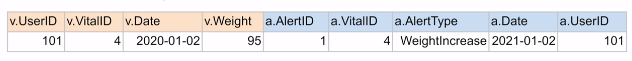 JOIN Alert a ON v.vitalID = a.vitalID;