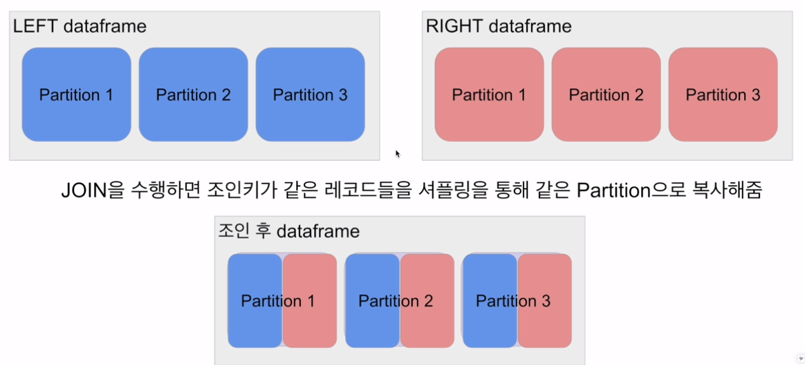 - 여기서 엄청난 셔플링(데이터 이동)이 발생하고, 파티션의 크기가 달라질 수 있다.