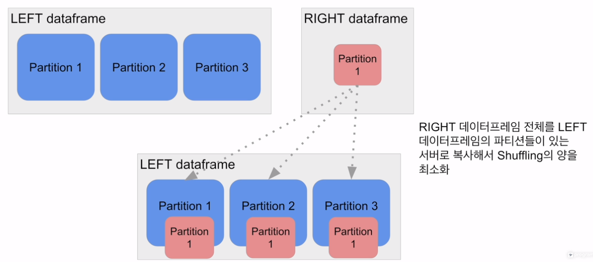 - 데이터 프레임 하나가 충분히 작으면 작은 데이터 프레임을 다른 데이터 프레임에 있는 서버들로 뿌리는 것(Broadcasting)