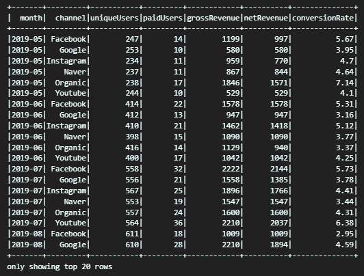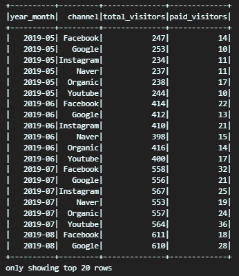 spark.sql("""SELECT sessionid, COUNT(1) count