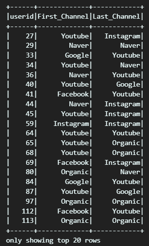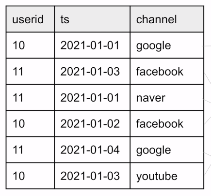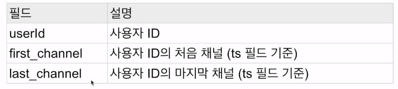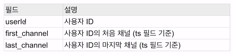 SELECT /*유저의 첫번째 유입채널, 마지막 유입 채널 구하기*/