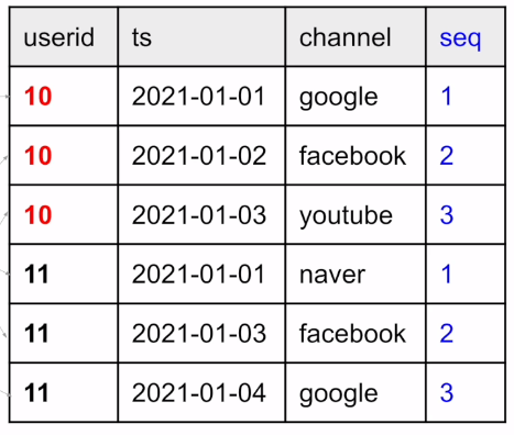 ROW_NUMBER() OVER (PARTITION BY userid ORDER BY ts ASC) AS seq_first,