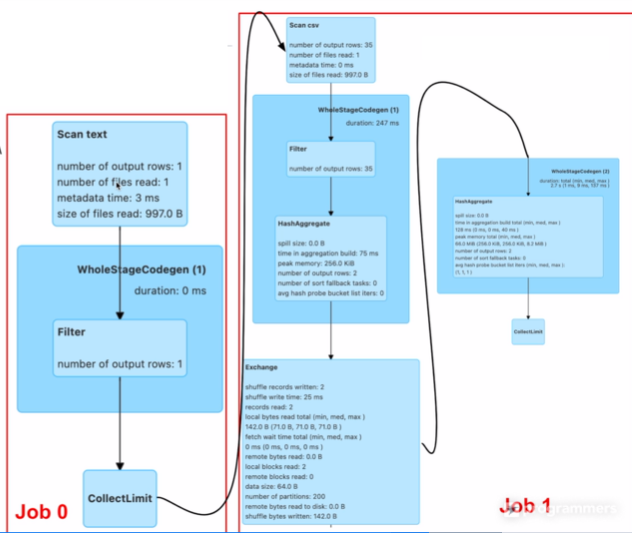 - Job1의 마지막은 show에 의해서 Trigger, collect limit이라고 작게 있는데 20개의 레코드를 collect해서 드라이버 쪽으로 보낸다.