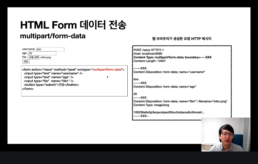- 다른 종류의 여러 파일과 폼의 내용과 함께 전송 가능(그래서 이름이 multipart)