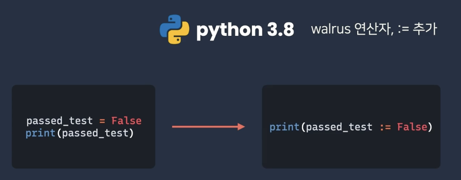 - walrus 연산자, := 추가가 가장 대표적인 예시입니다.