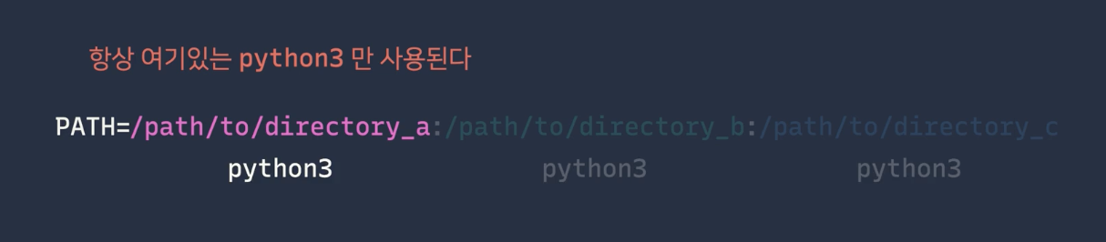 PATH 안에 있는 경로를 왼쪽부터 오른쪽 까지 탐색하고, 앞에서 python3라는 걸 찾으면 바로 적용한다.