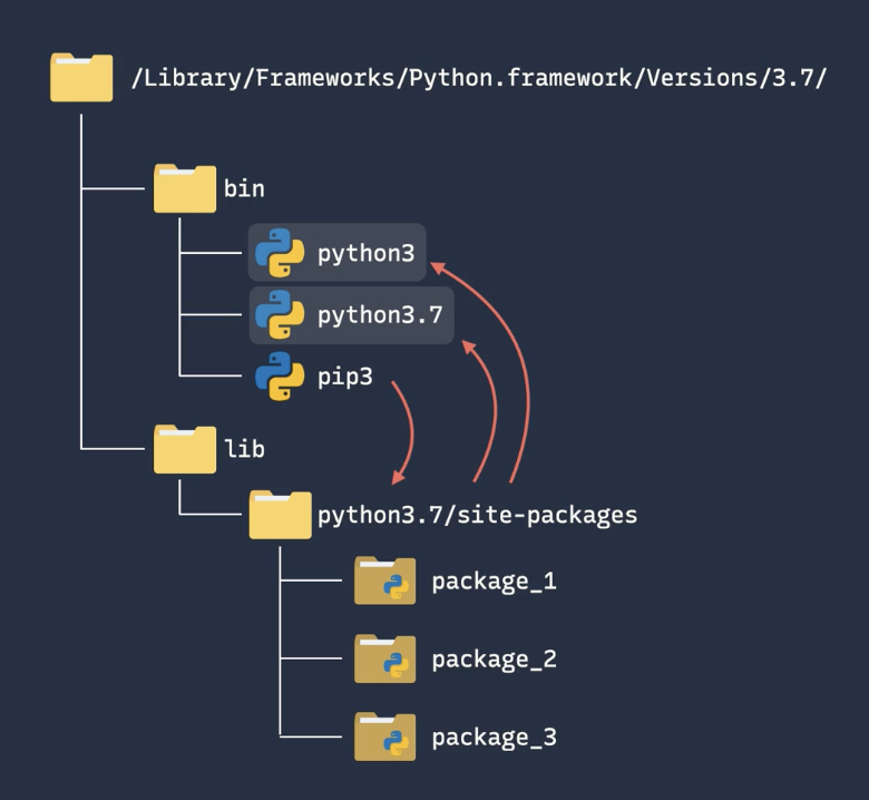 기본 디렉토리를 PATH 변수를 이용해서 관리하면, 항상 설정된 버전에 맞는 인터프리터에 site-packages라는 디렉토리에 파이썬 외부 패키지가 설치됩니다.